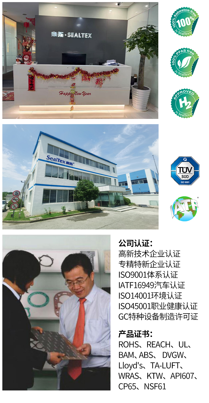 SealTex索拓密封可提供各種膨體四氟及改性四氟密封墊、壓縮纖維橡膠密封墊、軟木橡膠密封墊、石墨金屬復(fù)合增強墊片、植物纖維耐油紙墊、耐高溫云母復(fù)合密封墊、金屬涂覆密封墊RCM等。常見材料型號ST-2067、ST-4376、ST-2058、ST-3150、ST-9926、ST-3263等廣泛應(yīng)用于汽車、暖通空調(diào)、造船、海工、石油化工、核電、醫(yī)藥食品、新能源等各種工業(yè)領(lǐng)域。并有RoHS、REACH、UL、SVGW、DVGW、TSCA、CP65、ELV、PFAS-free、EN45545-2、FDA、BAM、TA-Luft、API607、ABS、GL、WRAS、NSF61、ACS、KTW、ELL、KTW-BWGL、TZW W270、FIRE-SAFE防火認(rèn)證等證書。可提供API622、ISO15848-1及FDA認(rèn)證的盤根填料;各種盤根及墊片切割工具。提供各種特殊尺寸的輥壓板如2000X2000mm、3000X3000mm、1500X4500m。密封墊厚度從0.15mm起.