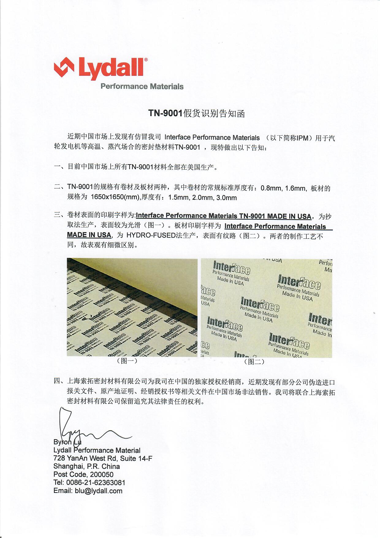 近期中國市場(chǎng)上發(fā)現(xiàn)有仿冒InterFace Performance Materials用于汽輪發(fā)電機(jī)等高溫、蒸汽場(chǎng)合的密封材料TN-9001,現(xiàn)特作出以下告知: