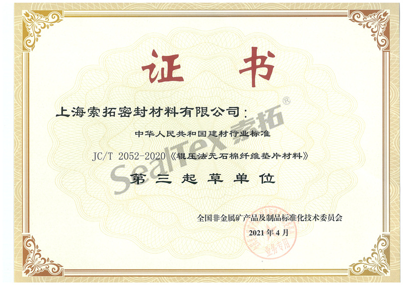 上海索拓密封材料有限公司(以下簡稱“我司”)參與起草了JC/T 2052-2020《輥壓法無石棉纖維墊片材料》標(biāo)準(zhǔn)