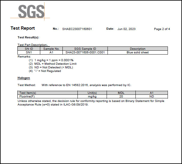 為滿足客戶需求近日SealTex索 ST-2058無石棉板通過了SGS進(jìn)行的鹵素(氟)檢測,檢測標(biāo)準(zhǔn)EN 14582-2016,報告顯示未測出氟,報告部分截圖如下: